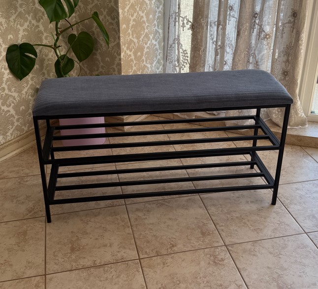 Верхня м’яка частина вже закріплена на каркасі. Для збирання потрібно лише прикрутити 2 бокові рамки та 2 полиці для взуття. У комплекті є все необхідне (гвинти та ключ).