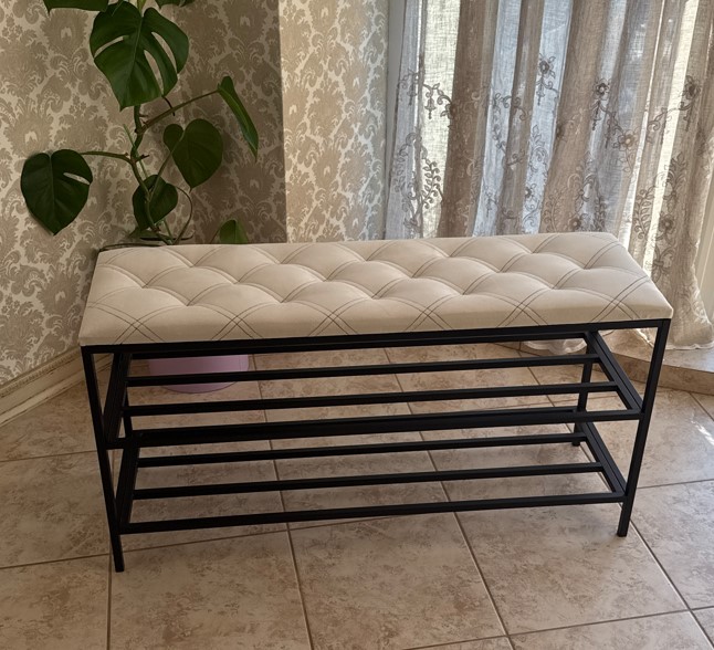 Верхня м’яка частина вже закріплена на каркасі. Для збирання потрібно лише прикрутити 2 бокові рамки та 2 полиці для взуття. У комплекті є все необхідне (гвинти та ключ).