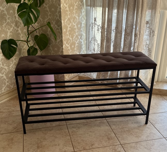 Верхня м’яка частина вже закріплена на каркасі. Для збирання потрібно лише прикрутити 2 бокові рамки та 2 полиці для взуття. У комплекті є все необхідне (гвинти та ключ).