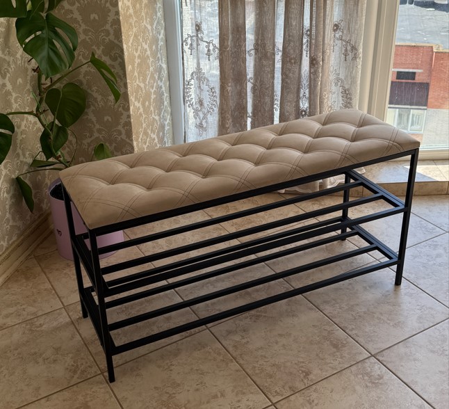 Верхня м’яка частина вже закріплена на каркасі. Для збирання потрібно лише прикрутити 2 бокові рамки та 2 полиці для взуття. У комплекті є все необхідне (гвинти та ключ).