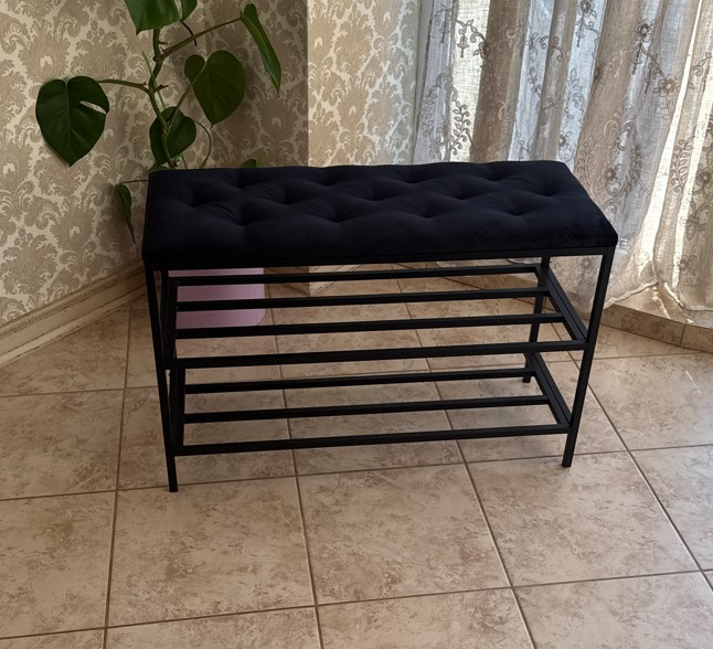 Верхня м’яка частина вже закріплена на каркасі. Для збирання потрібно лише прикрутити 2 бокові рамки та 2 полиці для взуття. У комплекті є все необхідне (гвинти та ключ).