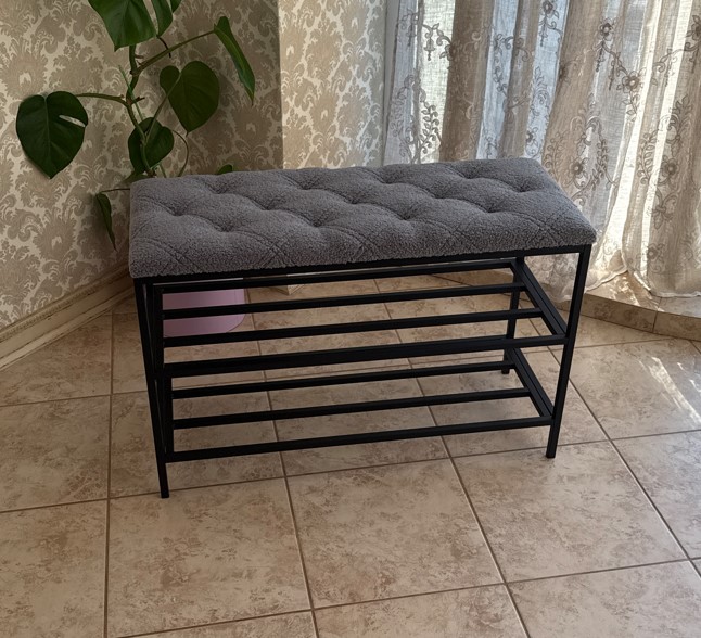 Верхня м’яка частина вже закріплена на каркасі. Для збирання потрібно лише прикрутити 2 бокові рамки та 2 полиці для взуття. У комплекті є все необхідне (гвинти та ключ).