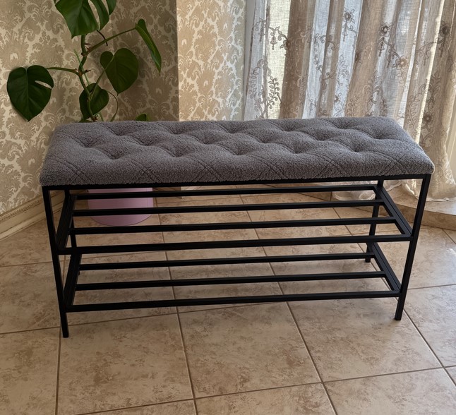 Верхня м’яка частина вже закріплена на каркасі. Для збирання потрібно лише прикрутити 2 бокові рамки та 2 полиці для взуття. У комплекті є все необхідне (гвинти та ключ).